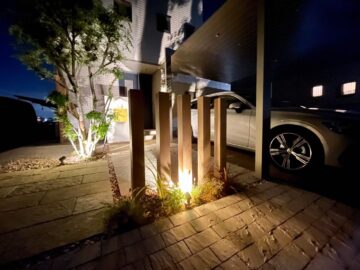 カーポートに埋め込みのダウンライト、そして植栽足元からのライトアップで