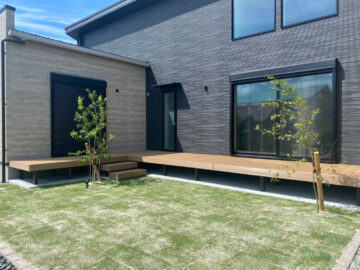 お庭部分には木の優しい風合いを感じるLIXIL 樹ら楽ステージ【木彫】のウッドデッキを設置しています。