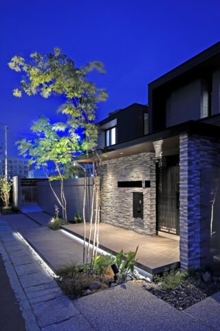 たとえば、門扉の両脇に照明を配置すると、夜間でも美しいシルエットを際立たせられます。